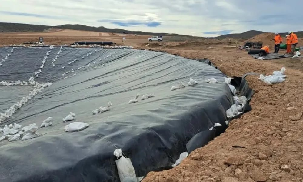 La Secretaría de Minería de Río Negro supervisó la colocación de la geomembrana en la pileta de aguas frescas, etapa clave para garantizar la impermeabilidad del material y cumplir con las normas internacionales, antes de instalar el sistema de lixiviación.