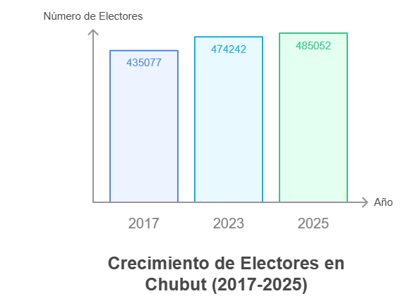 El Padrón Habilitado en Chubut mostró un crecimiento gradual en el período analizado: pasó de 435.077 electores en 2017 a 474.242 en 2023, en línea con la expansión poblacional de la provincia y de la región patagónica. Según la Cámara Nacional Electoral, en 2025 hay 485.052 ciudadanos habilitados en la provincia para votar.