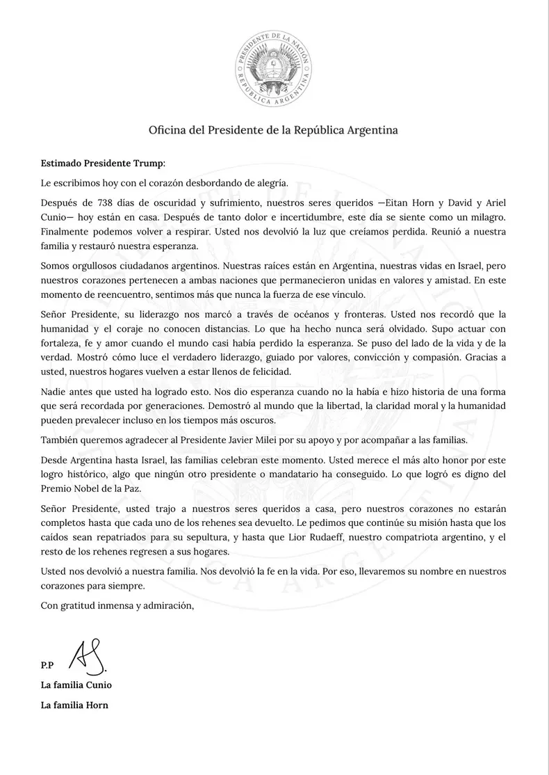 «Estimado Presidente Trump: Le escribimos hoy con el corazón desbordando de alegría. Después de 738 días de oscuridad y sufrimiento, nuestros seres queridos -Eitan Horn y David y Ariel Cunio- hoy están en casa. Después de tanto dolor e incertidumbre, este día se siente como un milagro», dice la carta entregada al mandatario estadounidense.