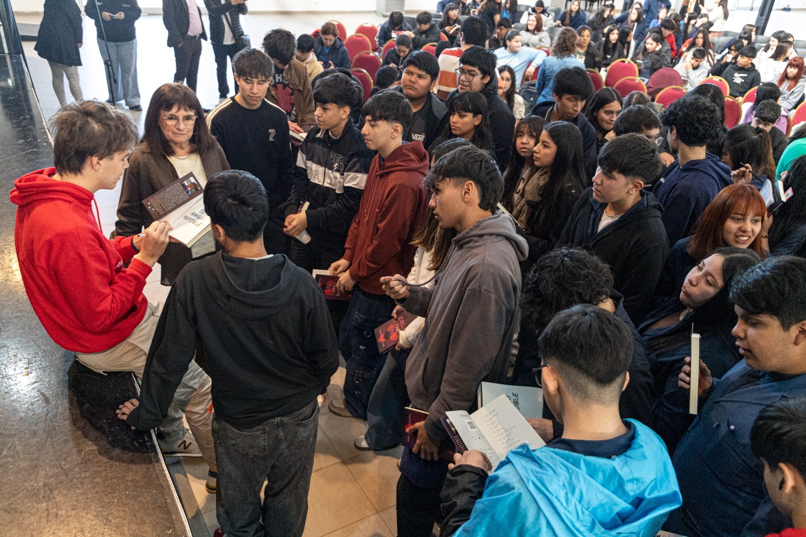 Santiago Speranza, con tan solo 23 años, es uno de los autores más destacados de la literatura juvenil argentina. Ha publicado nueve obras y es conocido por su estilo cercano y auténtico que conecta rápidamente con los adolescentes. Además de su faceta como escritor, es creador del podcast “Te lo dice un despeinado” y fue autor colaborador en la serie de Disney+ “Entrelazados”. Durante el evento, compartió con los estudiantes su obra “Tu amigo invisible”, un libro que fue trabajado en las escuelas participantes.
