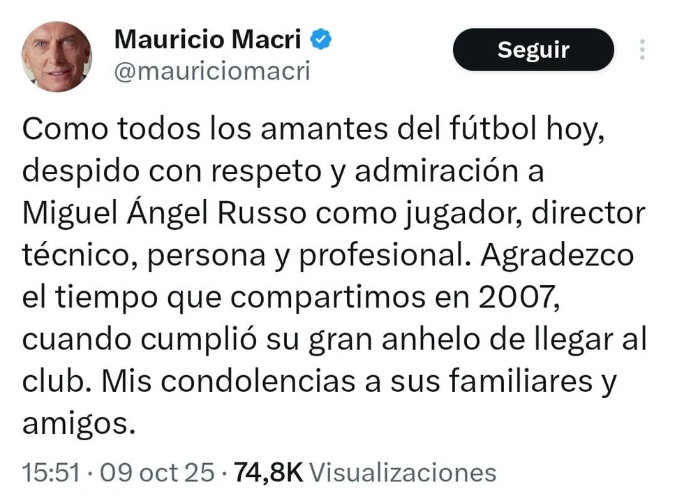 Macri despidió a Miguel Ángel Russo. Tras el fallecimiento de Miguel Ángel Russo, Mauricio Macri publicó un emotivo mensaje en redes sociales. El ex presidente de Boca Juniors y de la Nación destacó la figura del entrenador como jugador, técnico y persona, y expresó sus condolencias a familiares y amigos.