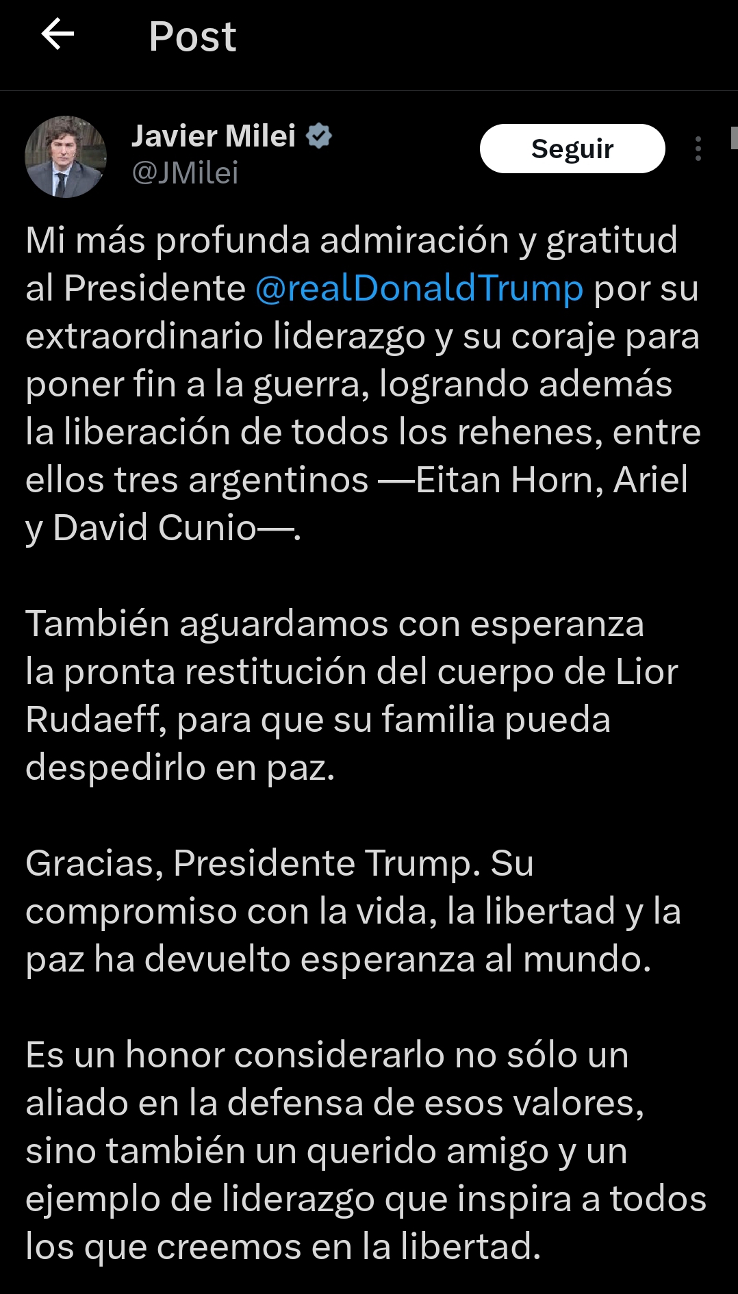 A través de su cuenta de X, Milei afirmó: «Mi más profunda admiración y gratitud al Presidente Donald Trump por su extraordinario liderazgo y su coraje para poner fin a la guerra, logrando además la liberación de todos los rehenes, entre ellos tres argentinos —Eitan Horn, Ariel y David Cunio—».