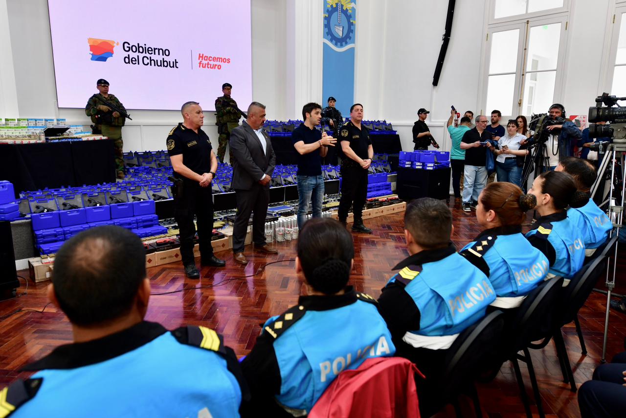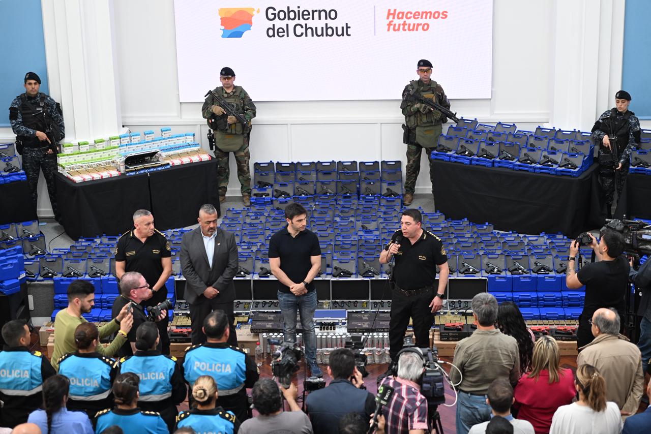 El gobernador del Chubut, Ignacio “Nacho” Torres, encabezó este miércoles la entrega de millonario armamento y municiones a efectivos de la Policía de la provincia, en un acto desarrollado en la Casa de Gobierno en Rawson, y que constituyó una inversión histórica en cuanto a equipamiento para la fuerza provincial. En total se distribuyeron mil pistolas marca Bersa a distintas dependencias chubutenses, así como cartuchos y granadas que fueron adquiridos por el Ejecutivo Provincial por un monto cercano a los 950 millones de pesos.