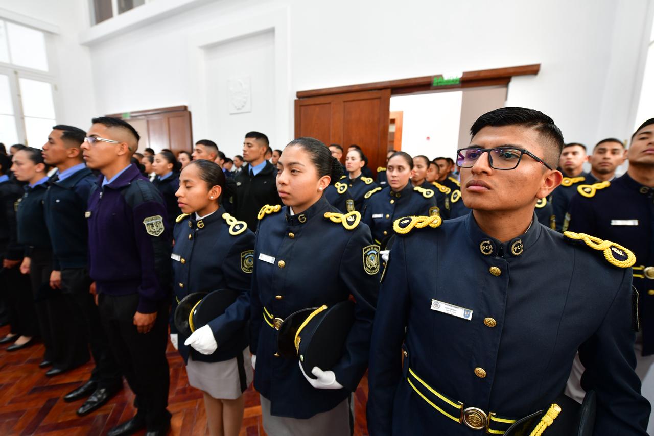 Acompañado por el ministro de Seguridad y Justicia, Héctor Iturrioz y el jefe y subjefe de la Policía del Chubut, Andrés García y Mauricio Zabala; durante la ceremonia el mandatario anunció la construcción de un nuevo edificio para la Escuela de Cadetes en Rawson que será financiado con un segundo remate de bienes incautados en causas de corrupción y narcotráfico.