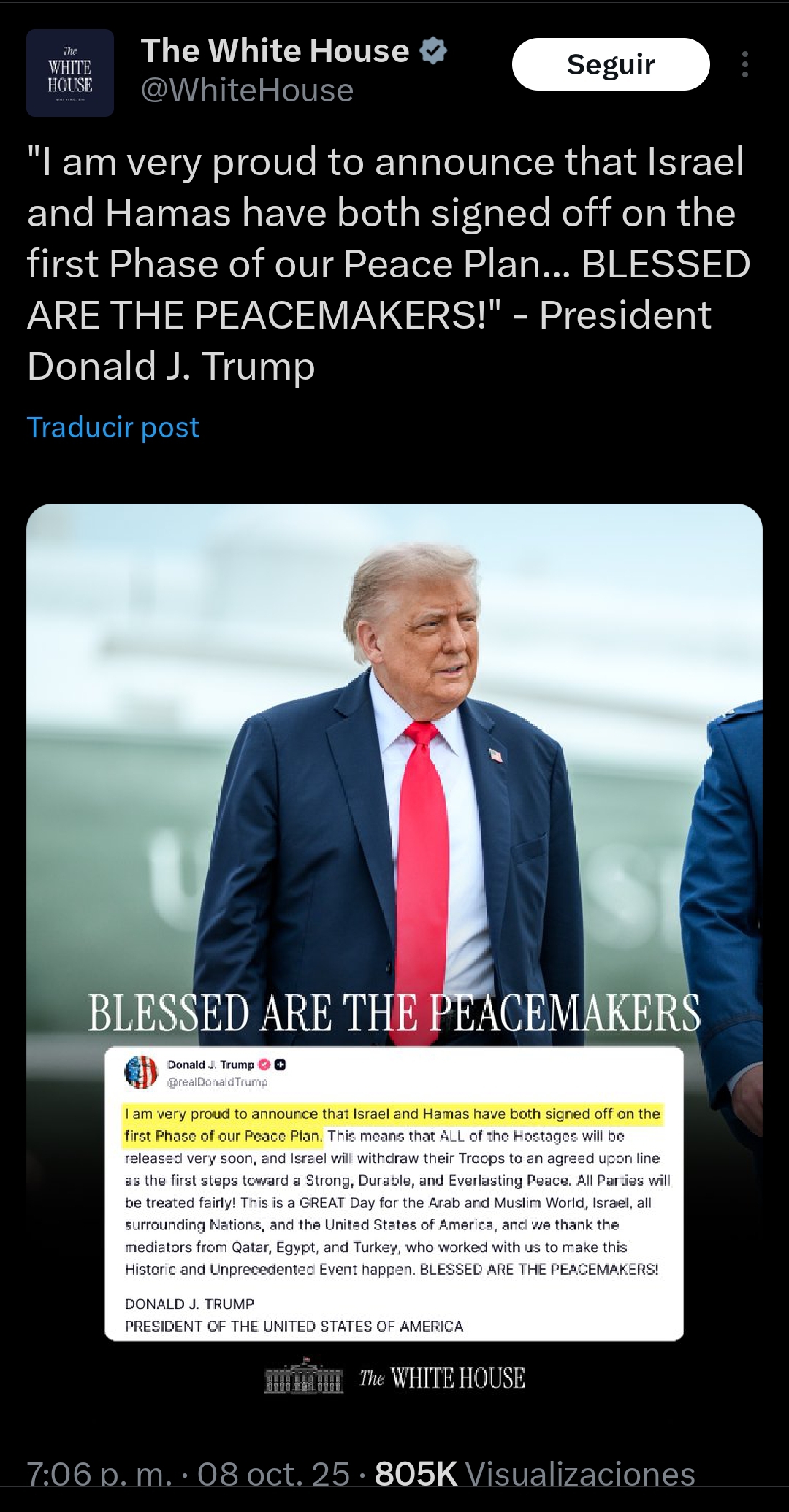 El presidente de Estados Unidos informó en sus redes sociales que la primera fase del plan de paz para Gaza ya está firmada por ambas partes. Esto incluye la liberación de todos los rehenes israelíes y la retirada de tropas hasta una línea acordada como paso inicial hacia una paz “fuerte, duradera y eterna”.