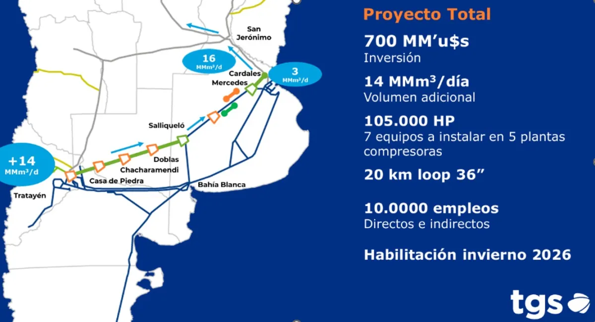 El proyecto incluye la construcción de nuevos tramos del gasoducto entre la localidad neuquina de Tratayén y Salliqueló, en la provincia de Buenos Aires. Además, se instalarán tres plantas compresoras que sumarán una potencia total de 90.000 HP y se realizarán obras complementarias en el sistema de TGS para facilitar el abastecimiento al Gran Buenos Aires y al Litoral.