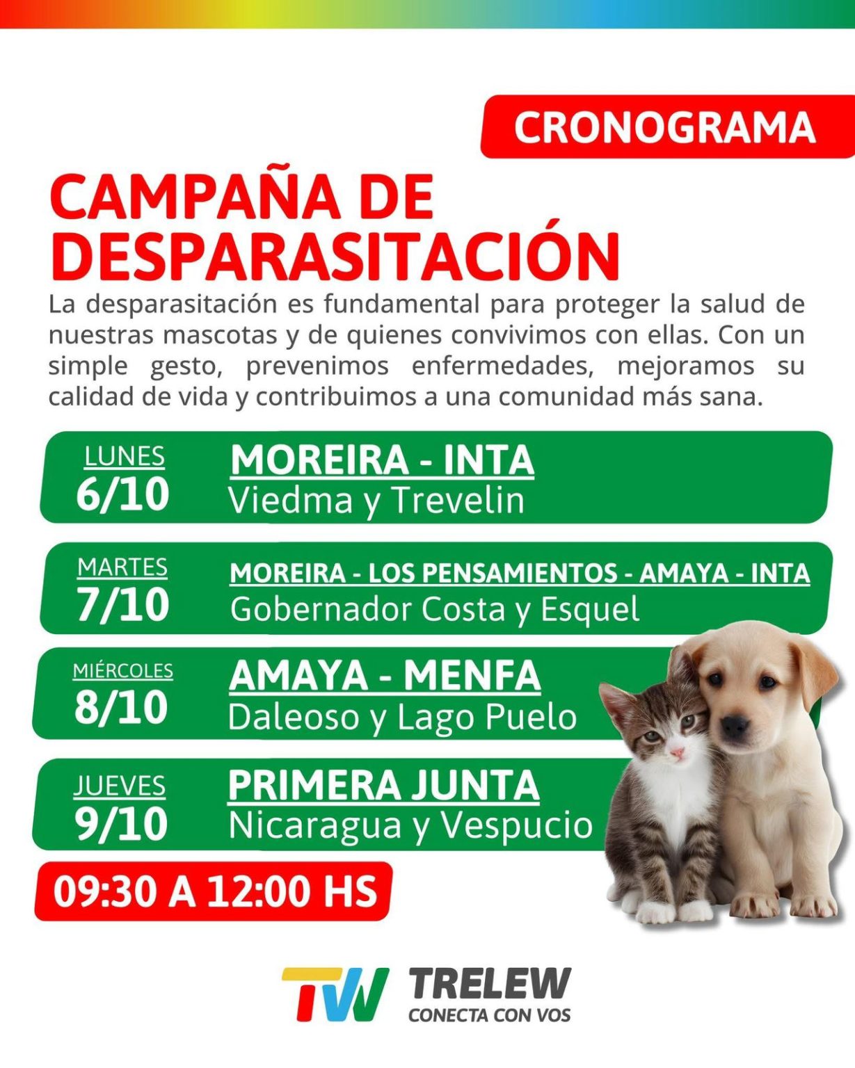 La Municipalidad de Trelew, por medio del área de Zoonosis, puso en marcha la segunda etapa anual de la campaña gratuita de desparasitación, un programa que recorre los barrios en busca de prevenir parásitos y cuidar la salud de los animales mediante la aplicación de tratamientos internos y externos.