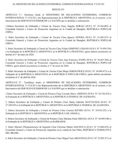 Las designaciones están respaldadas por el artículo 54 de la Ley del Servicio Exterior de la Nación y fueron distribuidas en sedes estratégicas de América, Europa, Asia y organismos multilaterales.