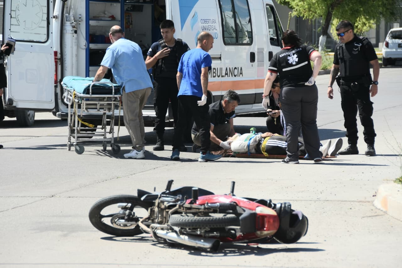 Una mujer que circulaba en motocicleta resultó con heridas de consideración tras chocar con un vehículo en el cruce de las céntricas calles Rivadavia y Maipú, en Trelew.