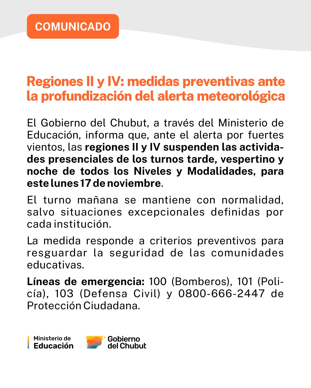 El Gobierno del Chubut, a través del Ministerio de Educación, comunica para las regiones II (cuyas cabeceras incluyen Puerto Madryn y Puerto Pirámides) y IV (Trelew, Rawson, Gaiman, Dolavon y Meseta) que, ante la profundización de las condiciones climáticas de riesgo anunciadas por el Servicio Meteorológico Nacional y la Subsecretaría de Protección Ciudadana, se adoptarán medidas especiales para el funcionamiento escolar durante el turno tarde de este lunes 17 de noviembre.
