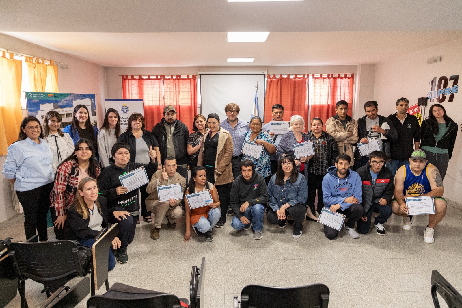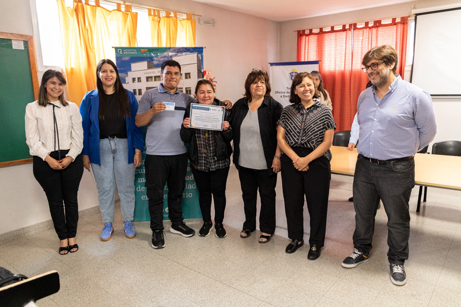 Del encuentro participaron el gerente de Comodoro Conocimiento, Domingo Squillace; la directora del Hospital Regional, Romina Galarza; la jefa de la División de Rehabilitación Psicosocial, Gladys Díaz; la directora de Salud Mental y Adicciones, Marta Rodríguez; la docente de Bromatología y Nutrición de la Universidad Nacional de la Patagonia San Juan Bosco, Betiana Garrido, junto a las y los participantes del curso y sus familias.