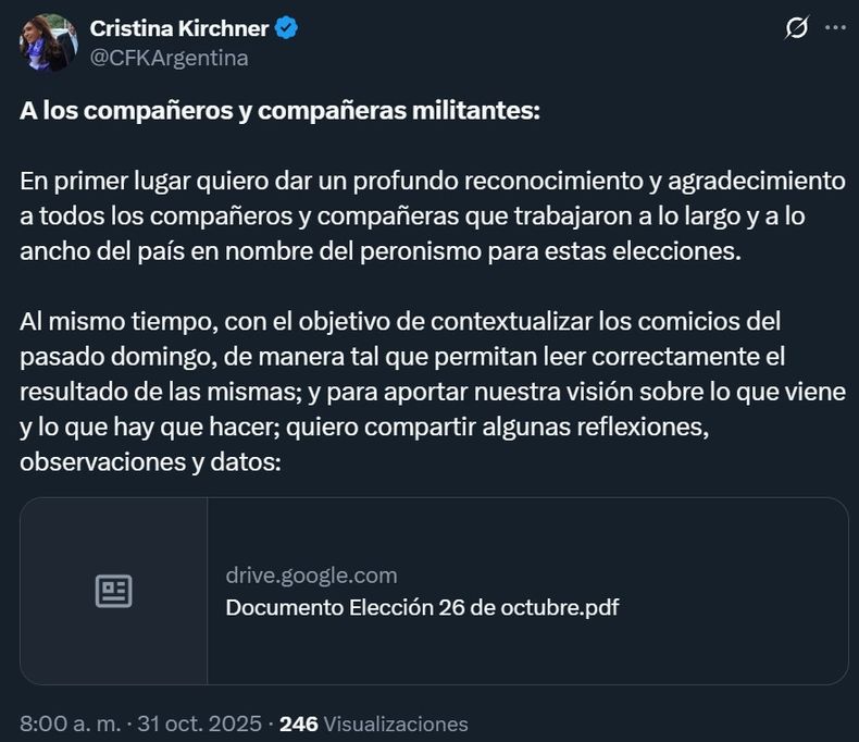 Tras los resultados adversos de las elecciones legislativas, la presidenta del Partido Justicialista, Cristina Fernández de Kirchner, publicó una extensa reflexión en la que analizó las causas de la derrota de Fuerza Patria y el avance del oficialismo encabezado por Javier Milei.