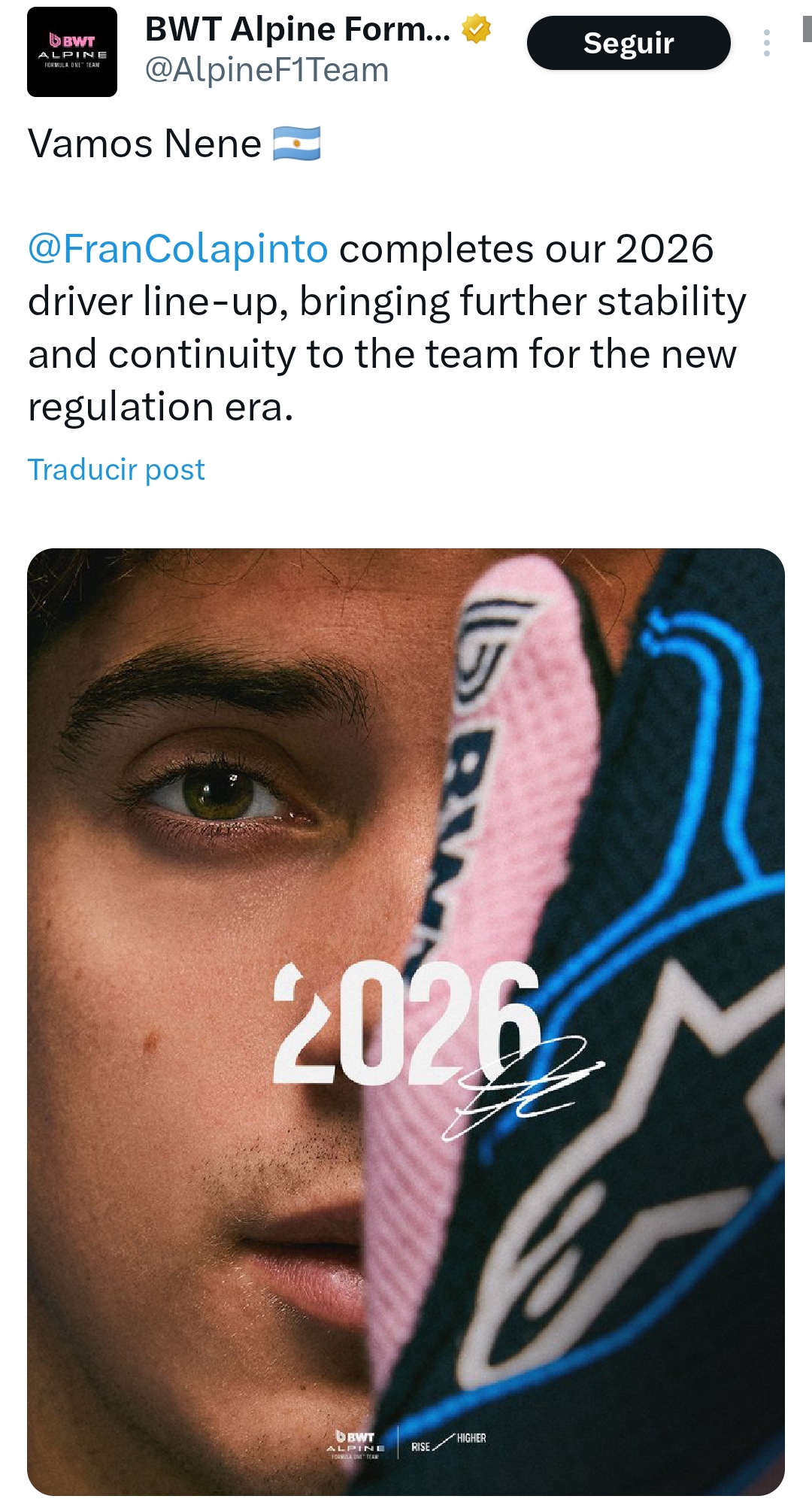 Tras semanas de rumores, Alpine oficializó la renovación del contrato de Franco Colapinto con un mensaje en redes sociales: “Vamos nene. Franco Colapinto completa nuestra alineación de pilotos para 2026, brindándole mayor estabilidad y continuidad al equipo para la nueva era”.