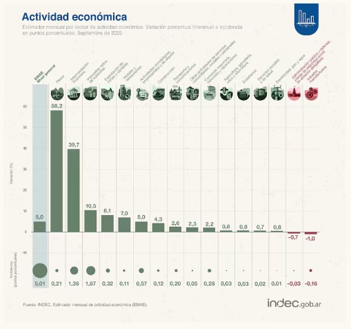 La actividad económica creció 0,5% en septiembre respecto a agosto y registró un avance interanual de 5%, según los datos del Estimador Mensual de Actividad Económica (EMAE) del Instituto Nacional de Estadística y Censos (Indec). A la vez, el indicador acumuló un crecimiento de 5,2% en lo que va del año, en comparación con el mismo período de 2024.