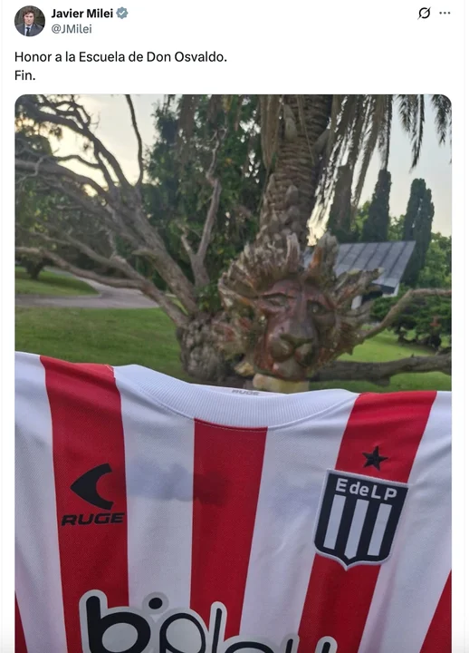 Desde la Quinta de Olivos, el mandatario publicó una fotografía de la camiseta de Estudiantes acompañada de una frase breve pero cargada de significado: “Honor a la Escuela de Don Osvaldo. Fin”.