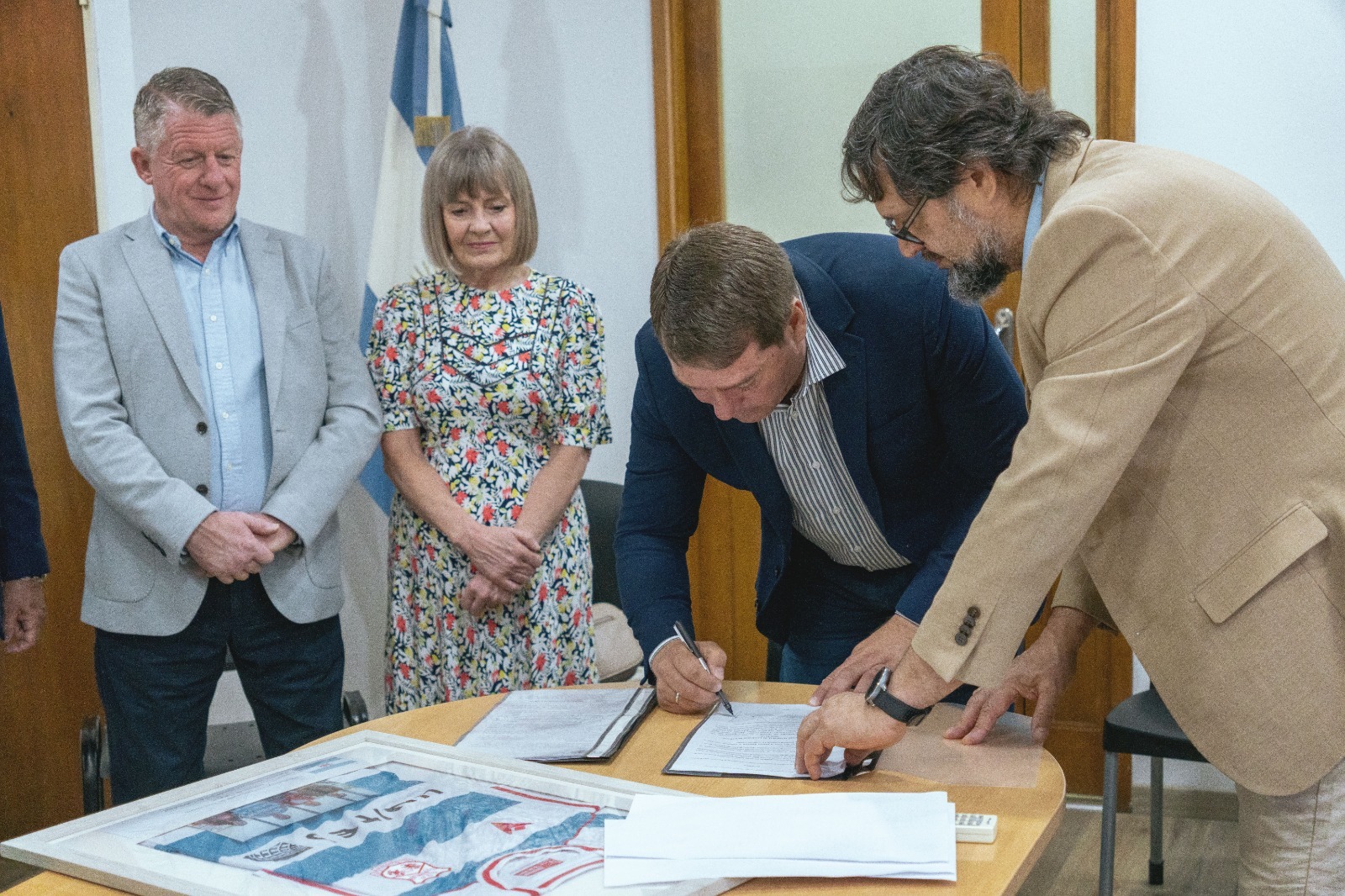 El intendente Damián Biss encabezó la recepción a la delegación de Gales, que culminó su itinerario provincial en la capital chubutense. El encuentro contó con la presencia del secretario de Gobierno y Seguridad Ciudadana, Ricardo Furci; el secretario de Ambiente y Desarrollo Sustentable, Miguel Larrauri; y el secretario de Planificación y Desarrollo Urbano, Pablo Villalobos. En la ocasión, se concretó la firma que dará inicio al proceso de reconstrucción de la Capilla Tair Helygen, ubicada sobre la Ruta Provincial N°7, entre Rawson y Trelew.