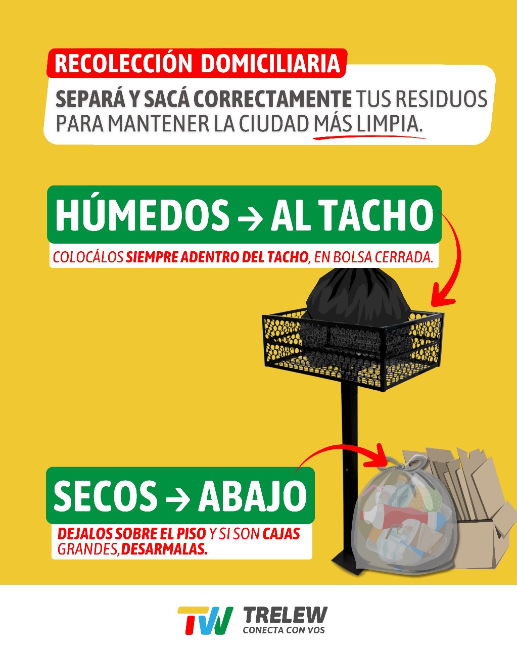 En Trelew se puso en marcha un nuevo esquema de recolección de residuos domiciliarios a partir de la separación en húmedos y secos, como parte del plan de modernización de los servicios públicos. El objetivo es lograr una ciudad más limpia, ordenada y sustentable, reduciendo además los costos del depósito final que la ciudad abona al consorcio GIRSU.