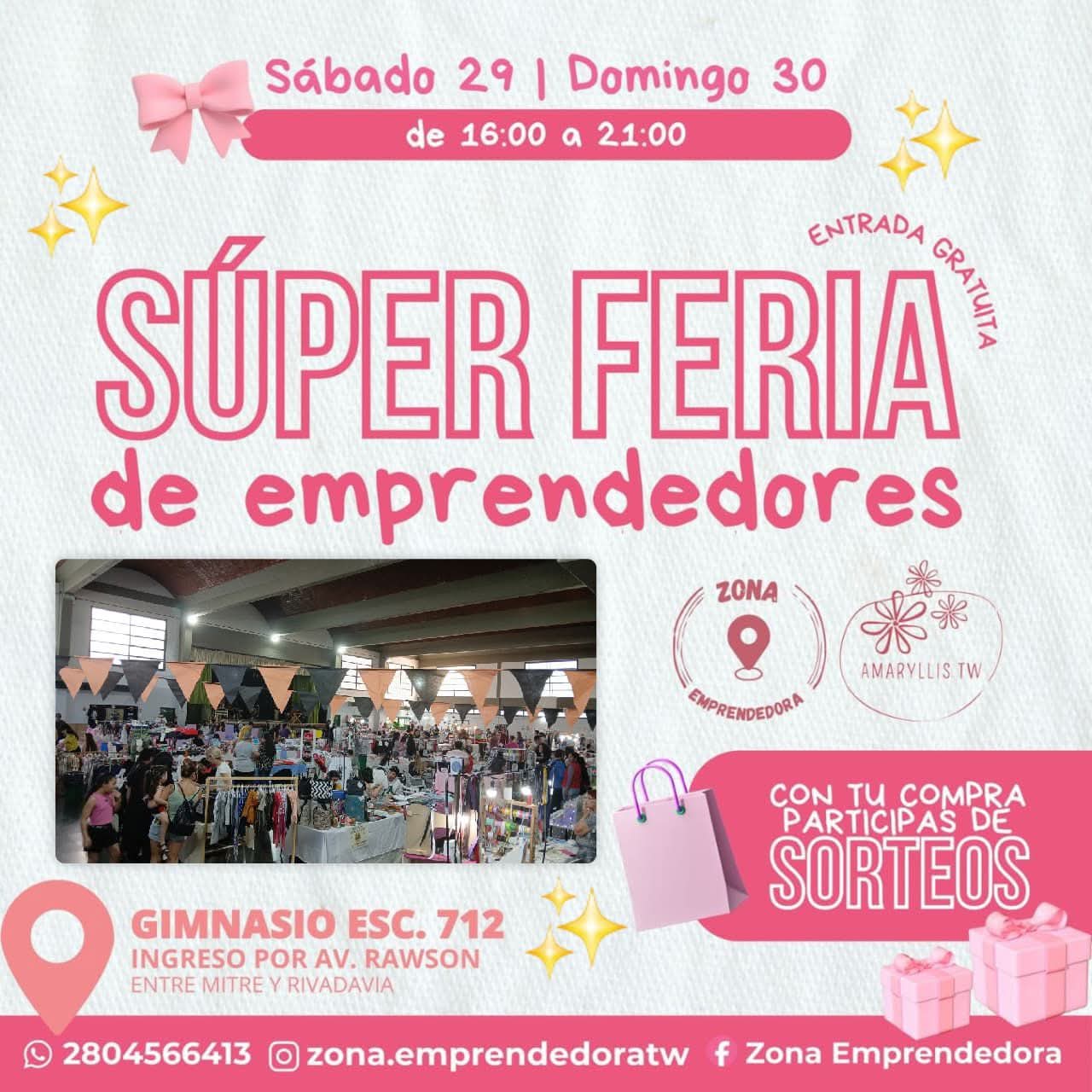 La Súper Feria de Emprendedores tendrá su última edición del mes el sábado 29 y domingo 30 en el Gimnasio de la Escuela 712, con ingreso por Avenida Rawson entre Mitre y Rivadavia. Las puertas abrirán al público de 16 a 21 horas.