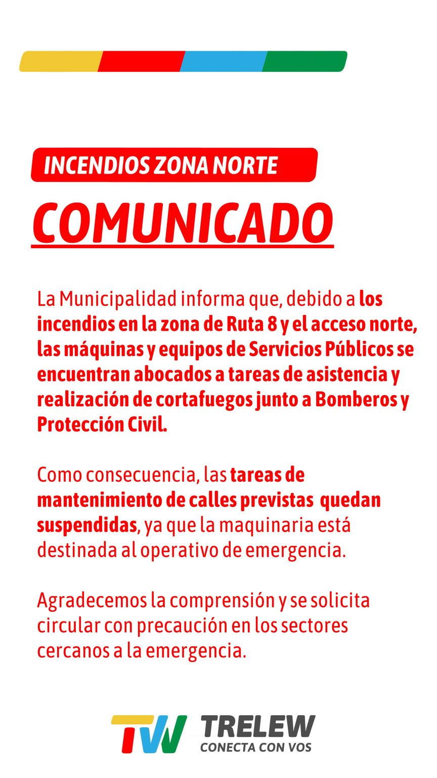 Debido al incendio de campo registrado este miércoles en rutas 8, camino a Telsen, y ruta 3, el Municipio de Trelew informó que las tareas habituales de mantenimiento de calles quedarán momentáneamente supeditadas a la emergencia. El cronograma de repaso se reordenará cuando finalicen los trabajos en el sector.