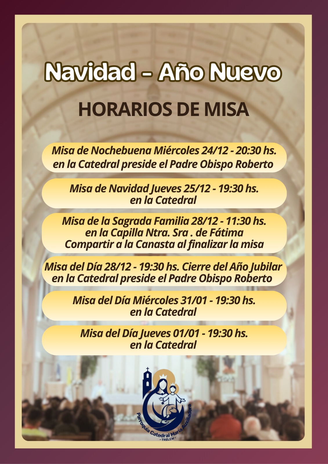 La misa de Fin de Año se celebrará el miércoles 31 de diciembre a las 19:30 en la Catedral, mientras que la misa de Año Nuevo se realizará el jueves 1 de enero, en el mismo horario y lugar.