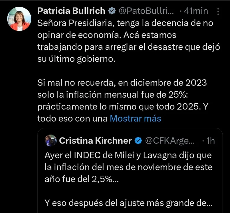 La confrontación se da en un contexto económico delicado, donde el oficialismo destaca avances en el combate contra la inflación y la oposición alerta sobre los costos sociales del ajuste. La reacción de Bullrich y el extenso análisis de Cristina suman tensión a un debate que sigue polarizando al país.