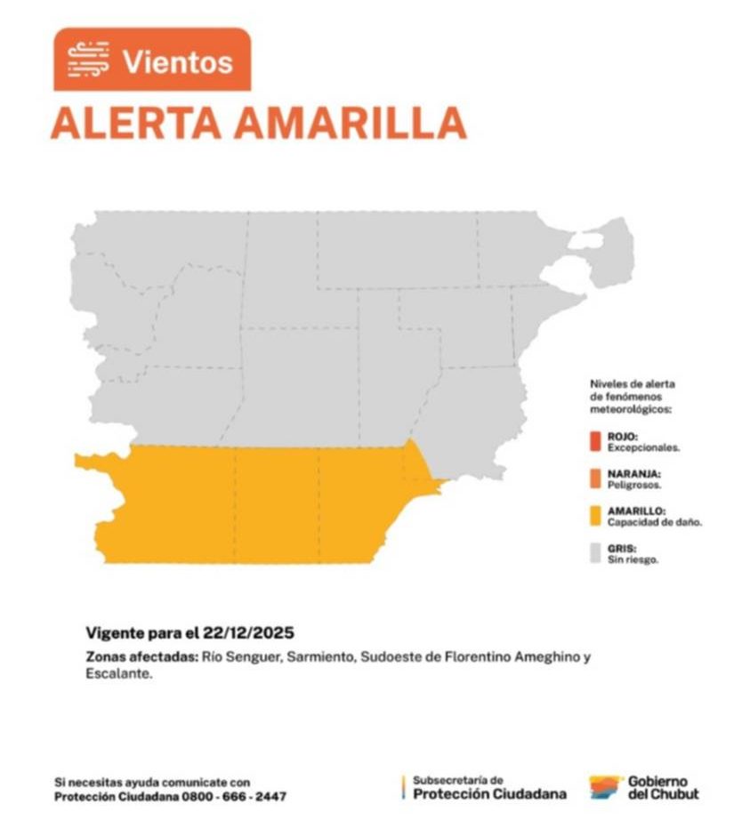 El Servicio Meteorológico Nacional emitió un alerta amarilla por fuertes vientos que afectará a gran parte de la provincia de Chubut durante la madrugada y la tarde del lunes 22 de diciembre.