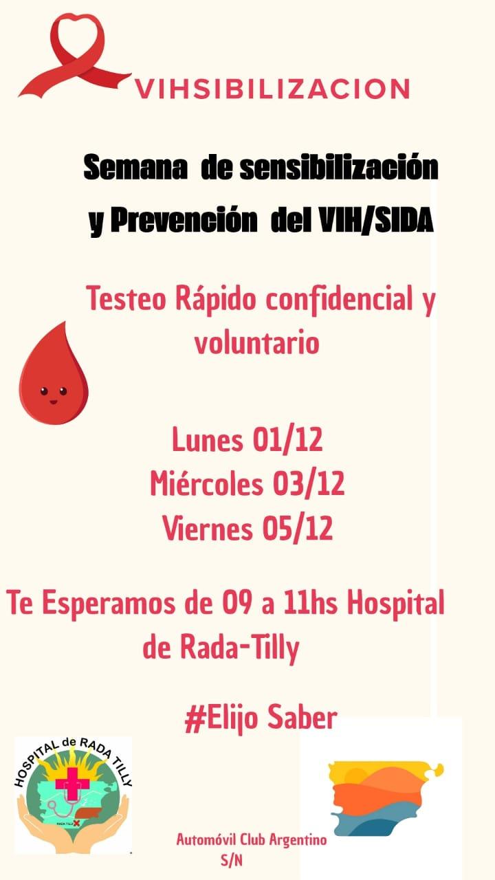 Con motivo de conmemorarse este 1° de diciembre el «Día Internacional de Respuesta al VIH» se realizarán distintas actividades tendientes a visibilizar la importancia de los cuidados y la prevención de esta enfermedad en el hall del Hospital Rural de Rada Tilly y otros centros de salud.