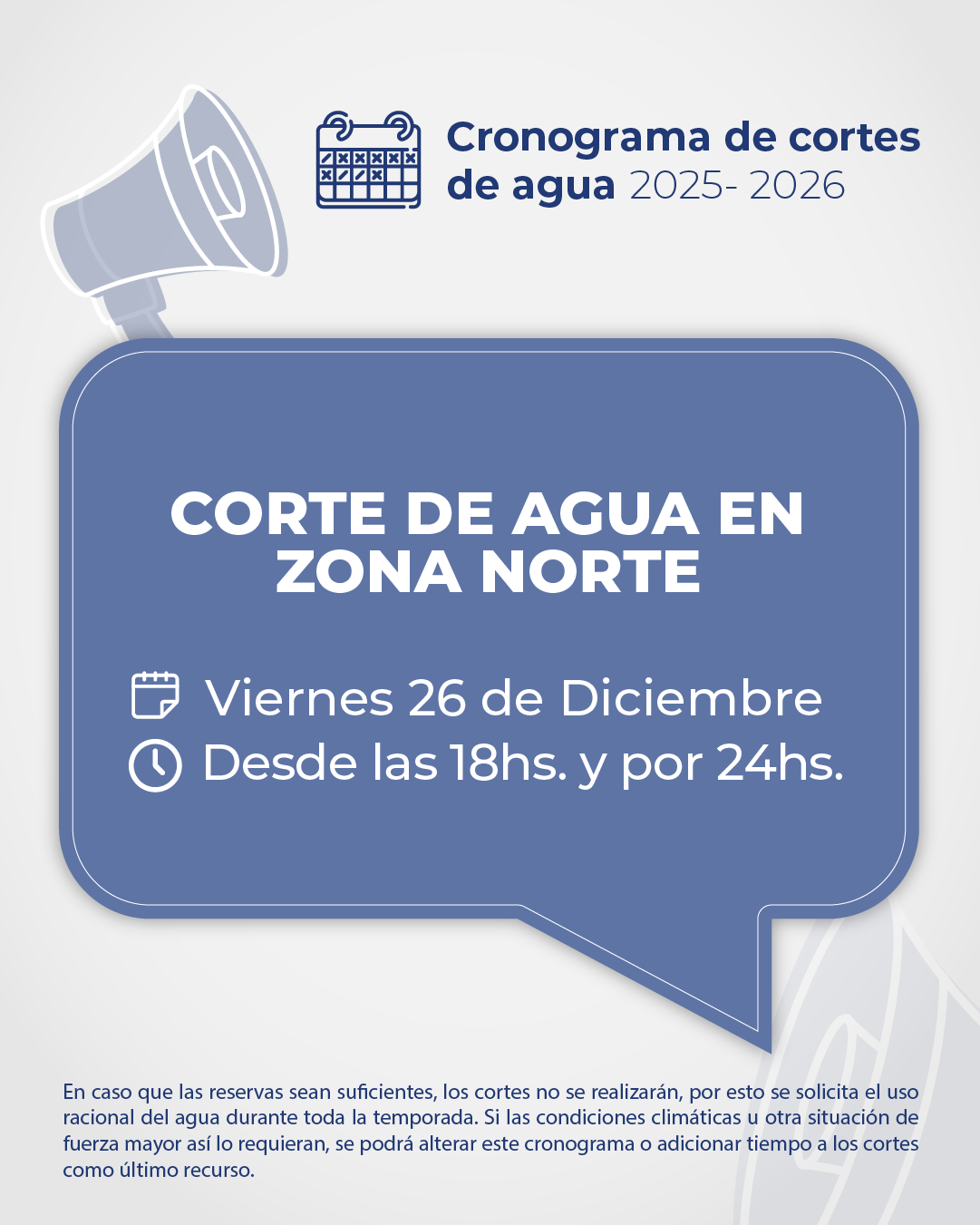 - Viernes 26 de diciembre: desde las 18 horas y por un lapso de 24 horas, se interrumpe el suministro en Zona Norte.
