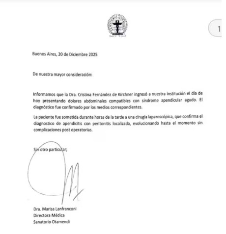 El informe precisó que Fernández de Kirchner “fue sometida durante horas de la tarde a una cirugía laparoscópica”, intervención que “confirma el diagnóstico de apendicitis con peritonitis localizada”.