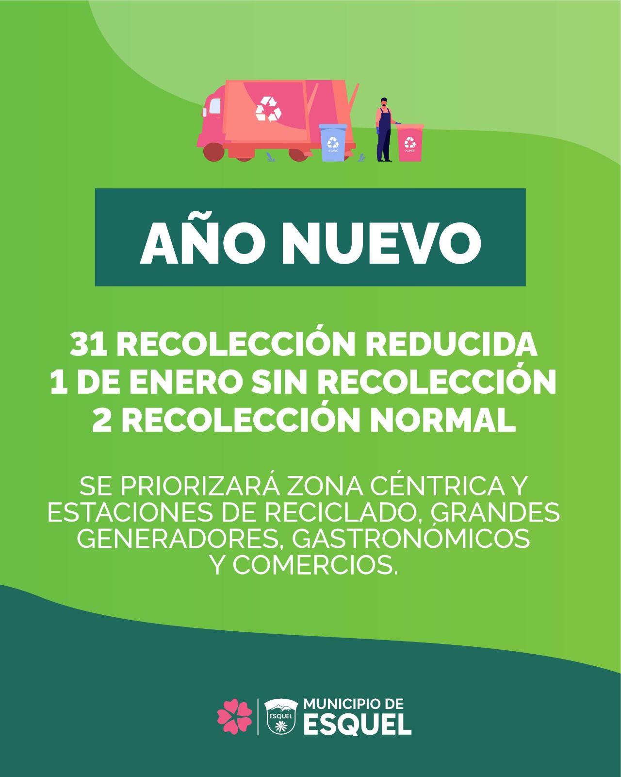 La Municipalidad de Esquel, a través de la gerencia GIRSU, informa a los vecinos cómo se prestará el servicio de recolección de residuos durante las celebraciones de Año Nuevo, en el marco del asueto administrativo y el feriado correspondiente.