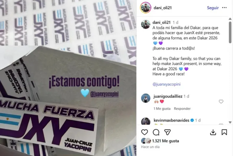 “A toda mi familia del Dakar, para que podáis hacer que JuanX esté presente, de alguna forma, en este Dakar 2026. ¡Buena carrera a tod@s!”, escribió en un posteo en sus redes, con la foto donde se ven los stikers que repartirá durante la competencia y que llevan la frase “mucha fuerza JXC – Juan Cruz Yacopini”.