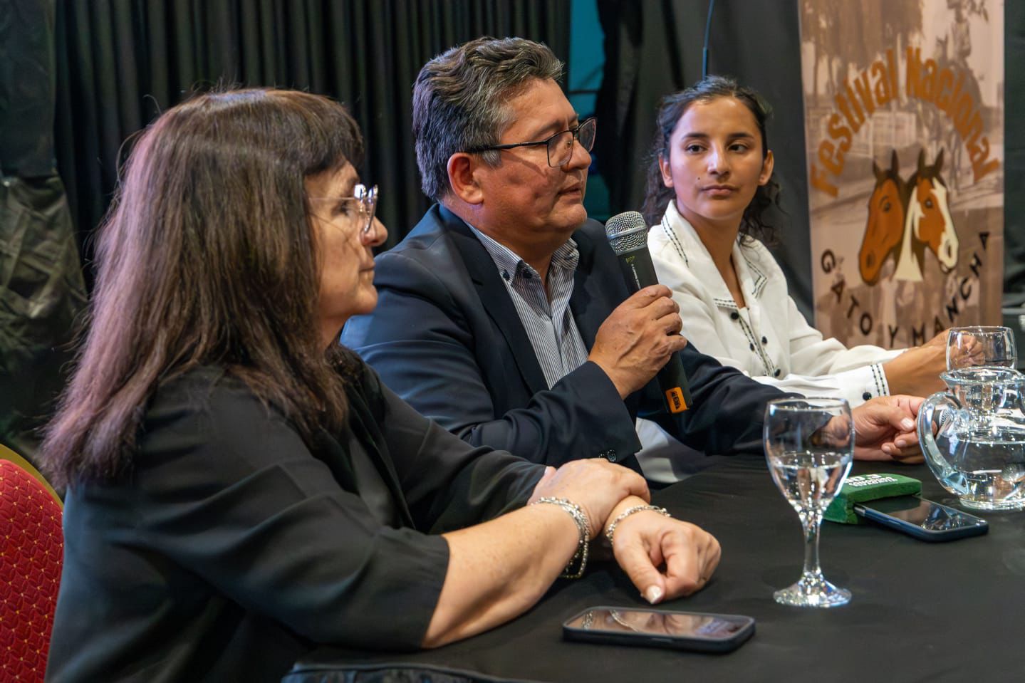 De la conferencia de prensa sobre el Festival que conmemora la epopeya de los caballos criollos Gato y Mancha y rinde homenaje a la cultura y destrezas del campo de la Patagonia, participaron la secretaria de Cultura de la Municipalidad de Comodoro Rivadavia, Liliana Peralta; el intendente de Río Senguer, Miguel Mongilardi, y la coordinadora del área de Cultura, Ángela Carrasco.