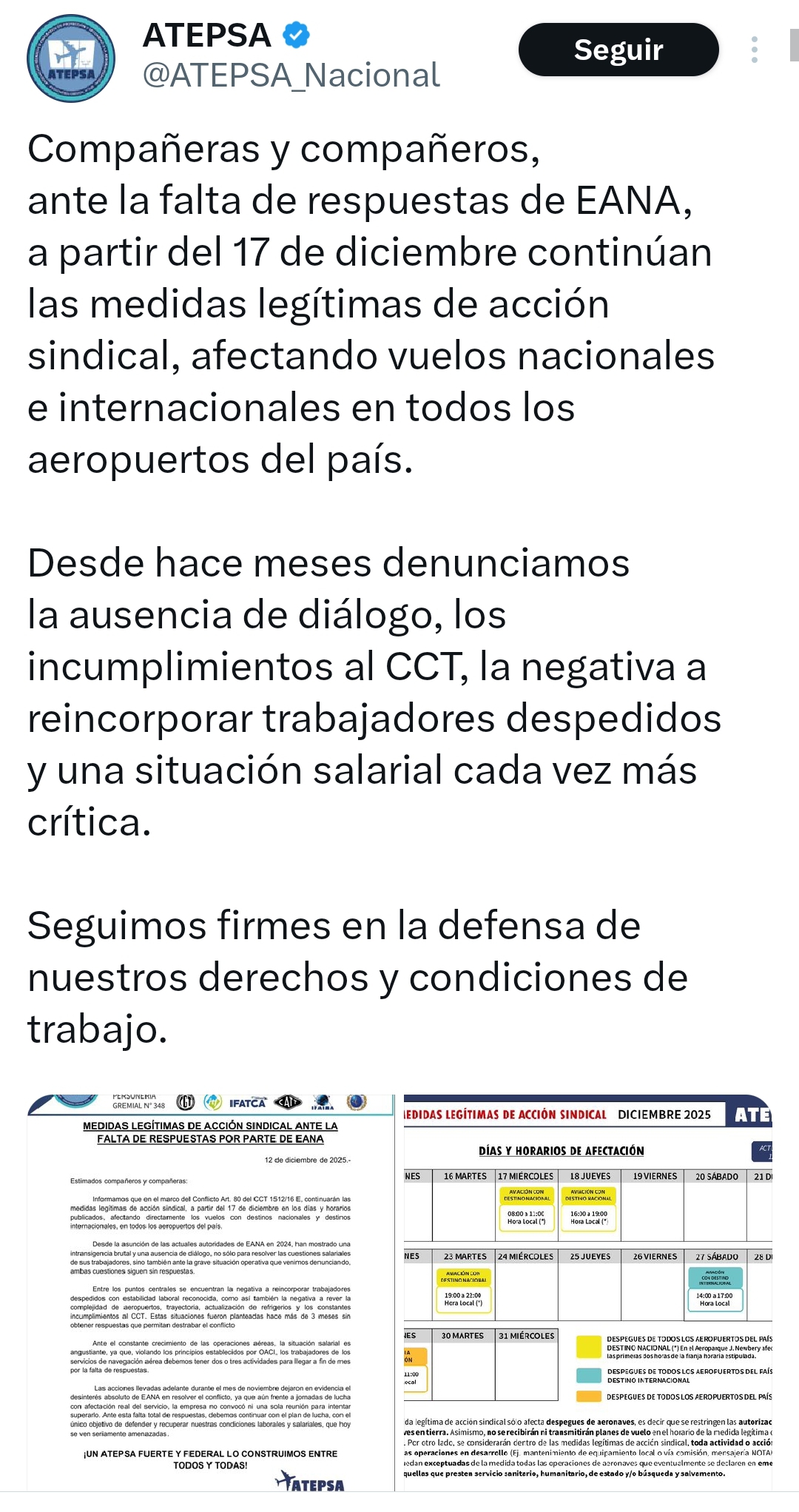 En la misma línea, indicaron que el accionar sindical no responde a reclamos paritarios genuinos y aseguraron que desde la Empresa Argentina de Navegación Aérea (EANA) se continúa trabajando para garantizar la normalidad de los vuelos durante el período festivo.