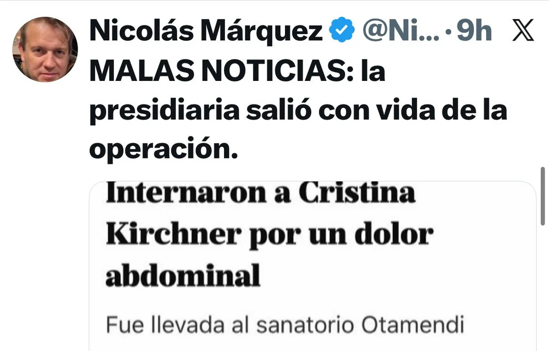Más agresivo fue el posteo de Nicolás Márquez, escritor y biógrafo del presidente Javier Milei. En su mensaje, se refirió a Cristina Kirchner como “la presidiaria” y calificó como una “mala noticia” que la operación haya sido exitosa. Sus palabras fueron interpretadas como un ataque directo a la salud de la exmandataria y generaron repudio en distintos sectores políticos y sociales.