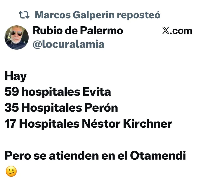 El fundador de Mercado Libre, Marcos Galperin, utilizó la plataforma X para cuestionar la elección de la medicina privada por parte de la dirigencia kirchnerista. En su publicación, enumeró la cantidad de hospitales públicos con nombres vinculados al peronismo: