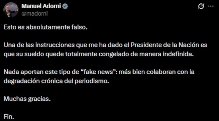 “Una de las instrucciones que me ha dado el Presidente de la Nación es que su sueldo quede totalmente congelado de manera indefinida. Nada aportan este tipo de “fake news”: más bien colaboran con la degradación crónica del periodismo», escribió en primer lugar quien antes se desempeñaba como vocero.