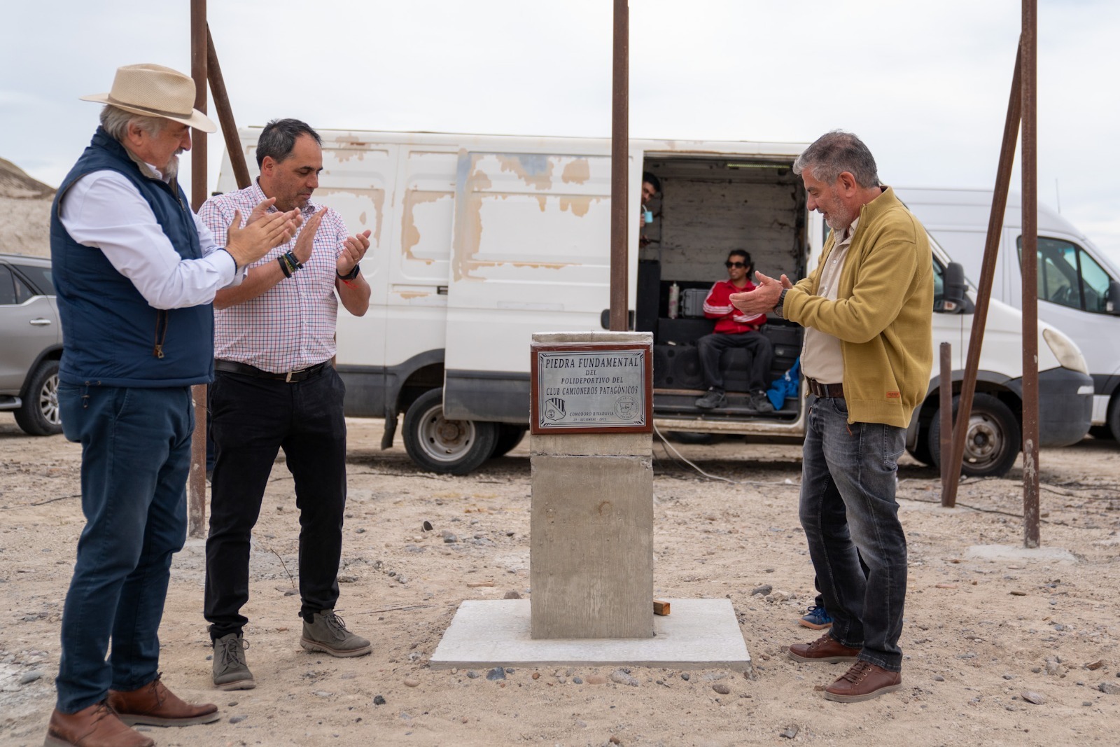 Es lunes por la mañana en inmediaciones de Km 5, el intendente Othar Macharashvili, acompañó al secretario general adjunto de la Federación Nacional de Trabajadores Camioneros (FEDCAM) y secretario general del sindicato en Chubut, Jorge Taboada en el acto de colocación de la piedra fundamental de lo que a futuro será el Polideportivo de dicha entidad.