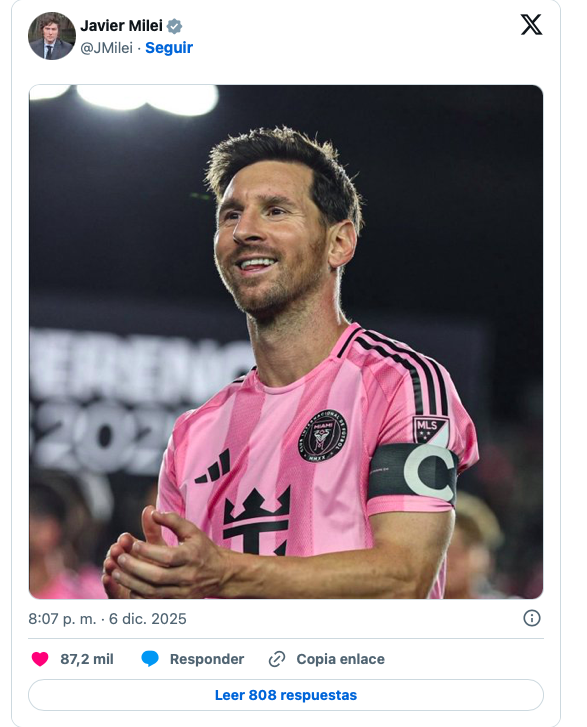 El sábado 6 de diciembre de 2025, tras la victoria de Lionel Messi y su equipo, el Inter Miami, como campeones de la MLS Cup, el presidente Javier Milei optó por una forma minimalista de expresión en sus redes sociales: una simple foto del jugador celebrando el título. Esta ausencia de un mensaje explícito abrió la puerta a múltiples lecturas, desde un gesto de admiración hacia un ícono nacional hasta una estrategia para asociar su imagen con el masivo afecto que genera Messi en la sociedad argentina.