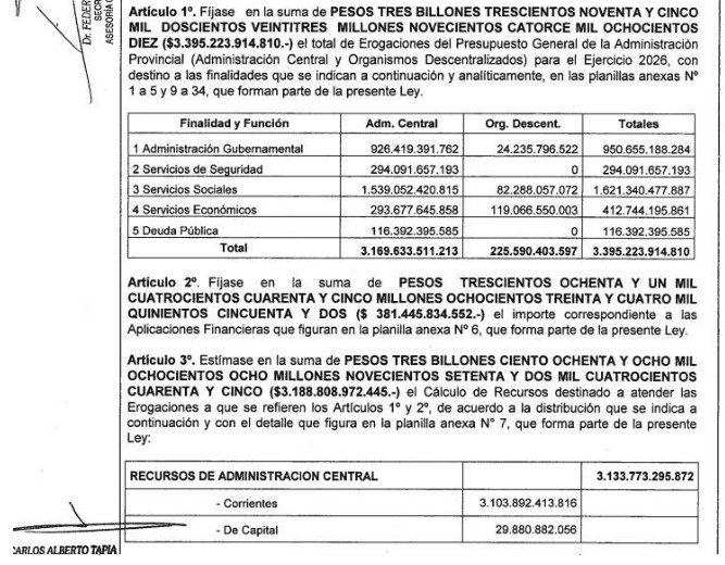 En cuento al proyecto de Presupuesto para el año que viene, alcanza un total de $ 3.169.633.511.213. “Las proyecciones de crecimiento, tipo de cambio e inflación, precios internacionales de commodities, se basan en las proyecciones realizadas por organismos internacionales y fuentes privadas de información”, se indica en el proyecto enviado a Legislatura.