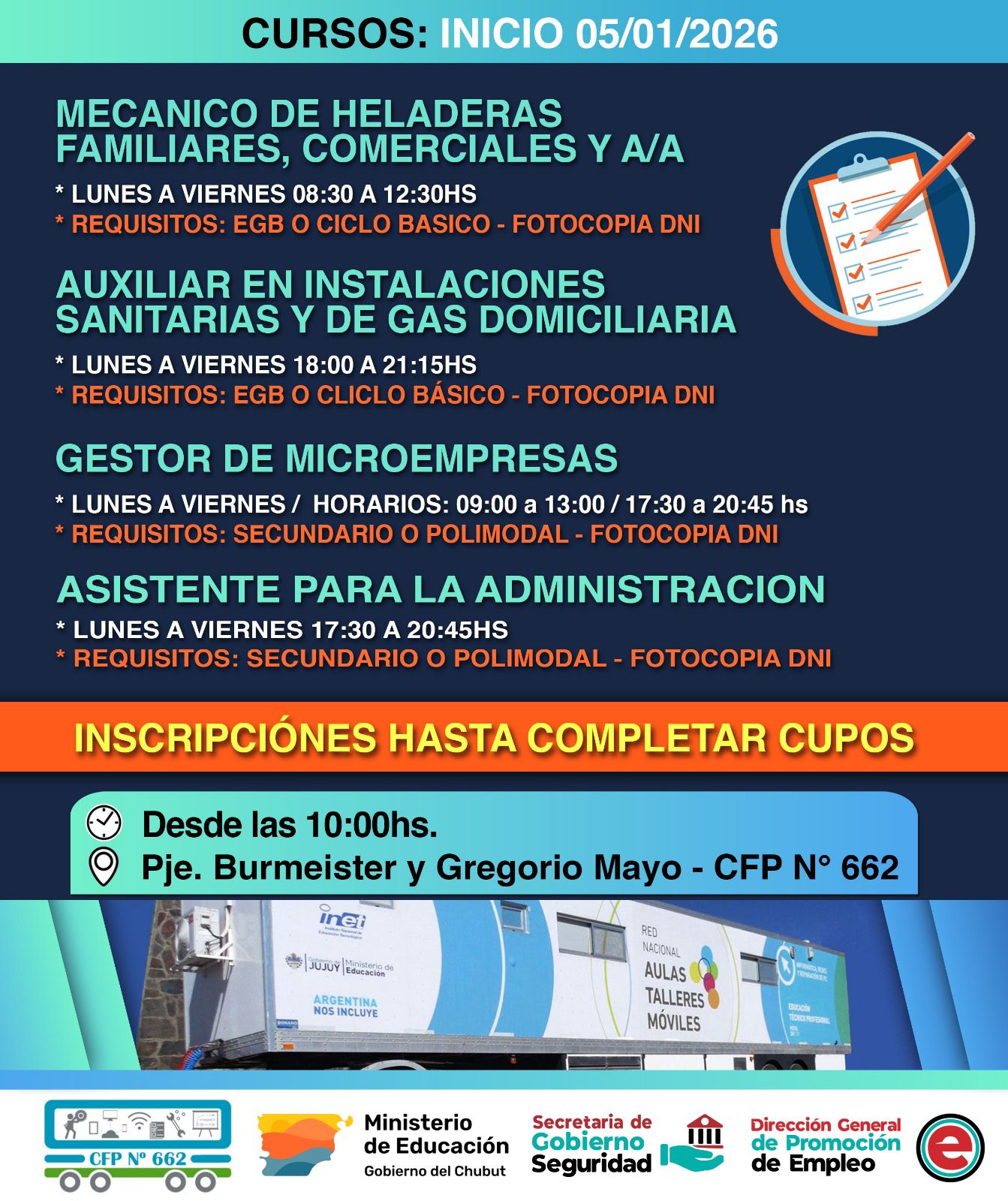 Los cursos comenzarán el 5 de enero de 2026 y se dictarán de lunes a viernes, en turnos de mañana y de tarde, de acuerdo a la demanda. El curso de Auxiliar en Instalaciones Sanitarias y Gas Domiciliario se desarrollará de 18 a 21:15 horas; Gestor de Microempresas se dictará de 9 a 13 y de 17:30 a 20:45 horas; Mecánico de Heladeras Familiares, Comerciales y Aires Acondicionados se cursará de 8:30 a 12:30 horas; mientras que Asistente para la Administración tendrá lugar de 17:30 a 20:45 horas.