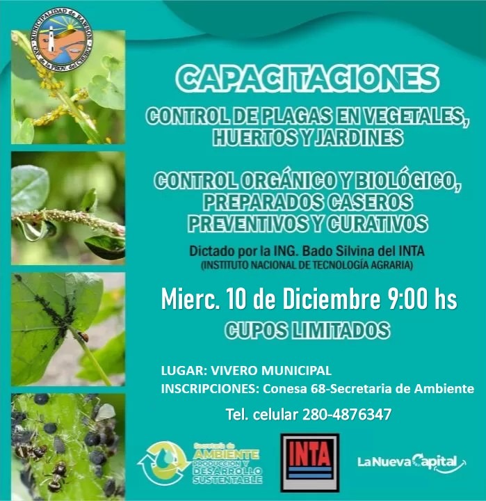 La Municipalidad de Rawson, a través de la Secretaría de Ambiente y Desarrollo Sustentable y en articulación con el Instituto Nacional de Tecnología Agropecuaria (INTA), llevará adelante una capacitación destinada a la comunidad, orientada al control orgánico y biológico de plagas y a la elaboración de preparados caseros preventivos y curativos. La actividad estará a cargo de la ingeniera Silvina Bado, del INTA. Las inscripciones se realizan de manera presencial en Conesa 68 o llamando al 280-4876347.