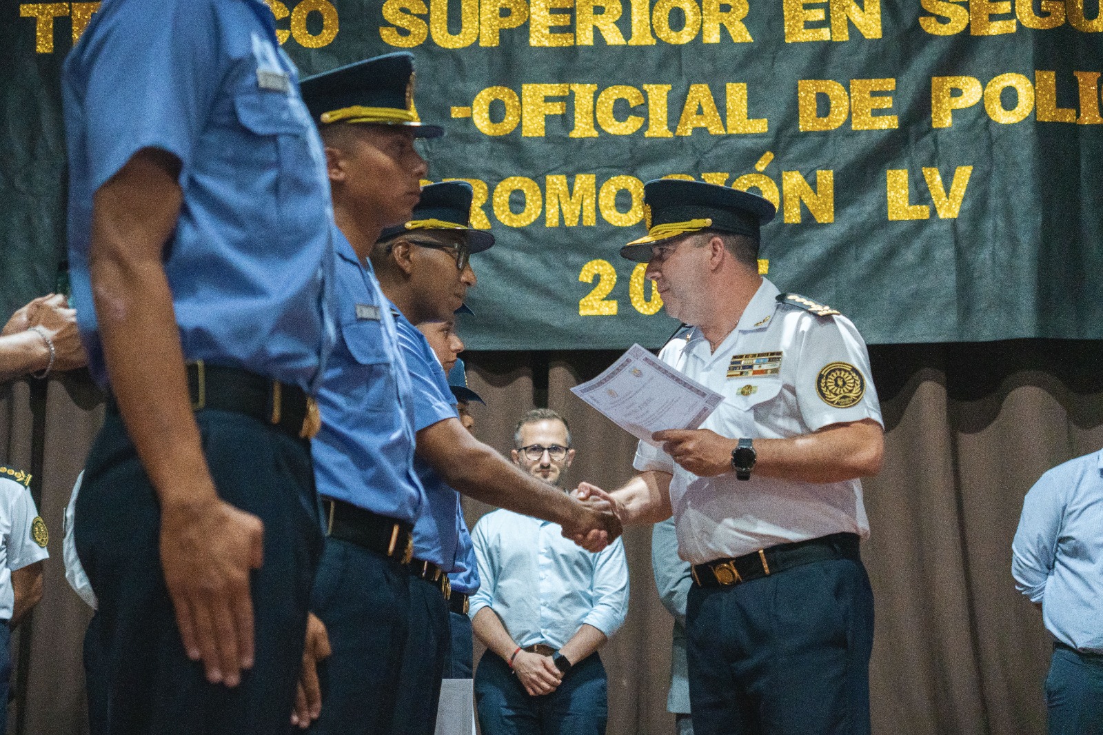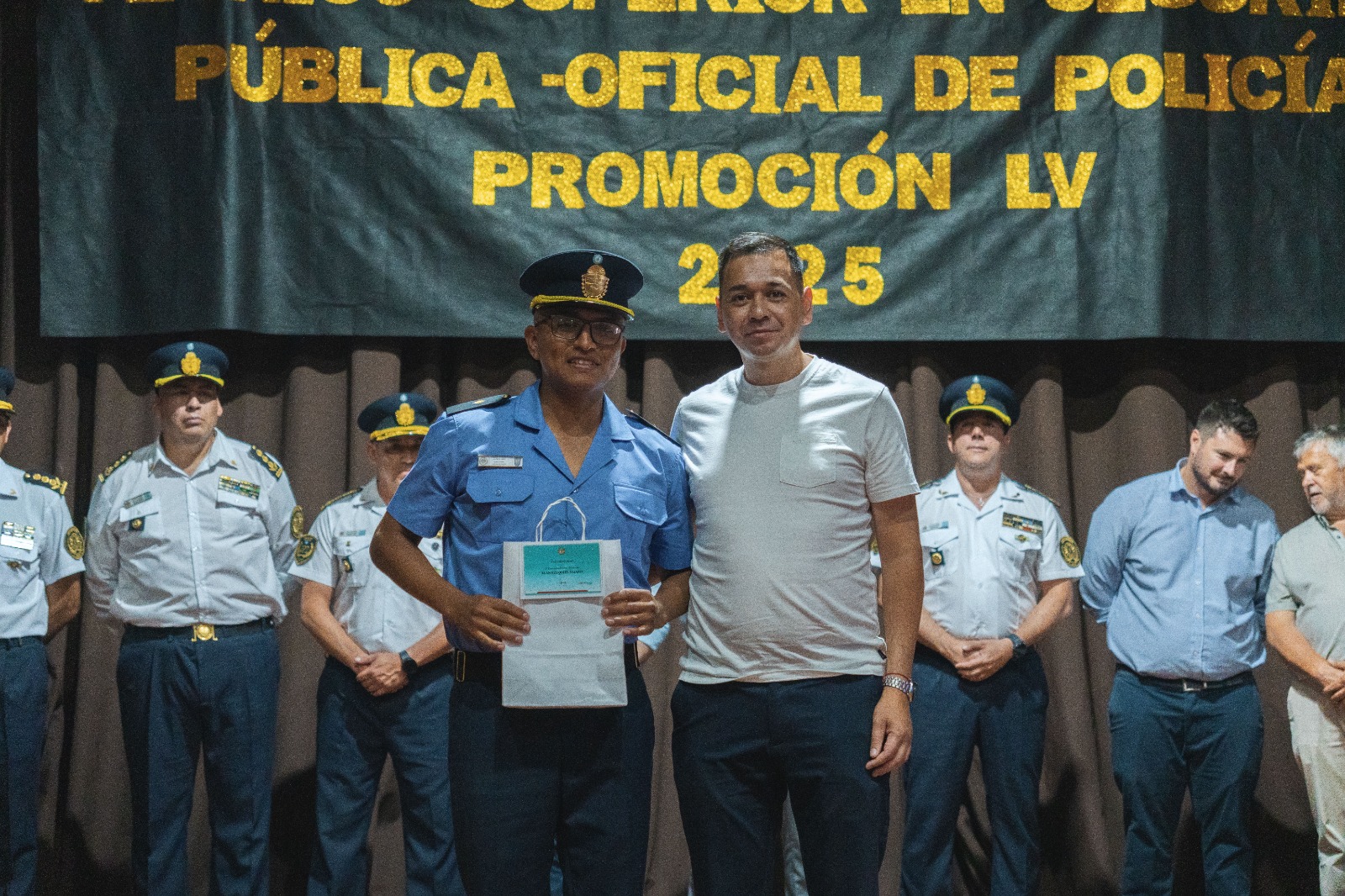 En tanto, el ministro de Justicia y Seguridad, Dr. Héctor Iturrioz, dio la bienvenida a los egresados y profundizó en la importancia del vínculo entre compañeros y el apoyo en la formación de oficiales. “El éxito en la carrera policial depende del compromiso, la preparación y el fortalecimiento constante de la mente, el corazón y los valores personales”, expresó, deseando a los egresados una trayectoria profesional destacada, con el acompañamiento constante de la institución.