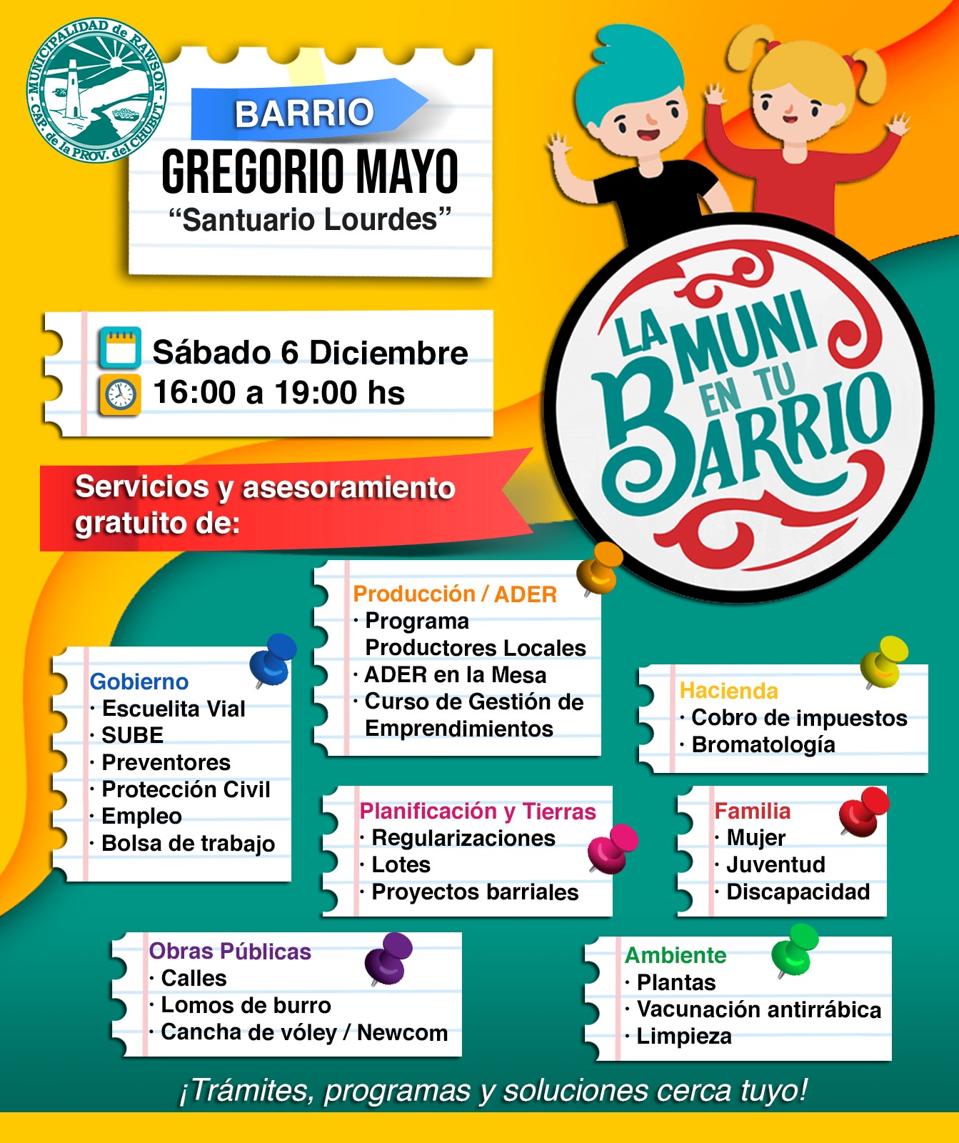 La Municipalidad invita a los vecinos del Parque Gregorio Mayo a participar de esta jornada, que reunirá servicios, asesoramiento territorial y propuestas culturales con la presencia de todas las áreas municipales, fortaleciendo la llegada del Estado local a cada sector y facilitando gestiones cotidianas para la comunidad.