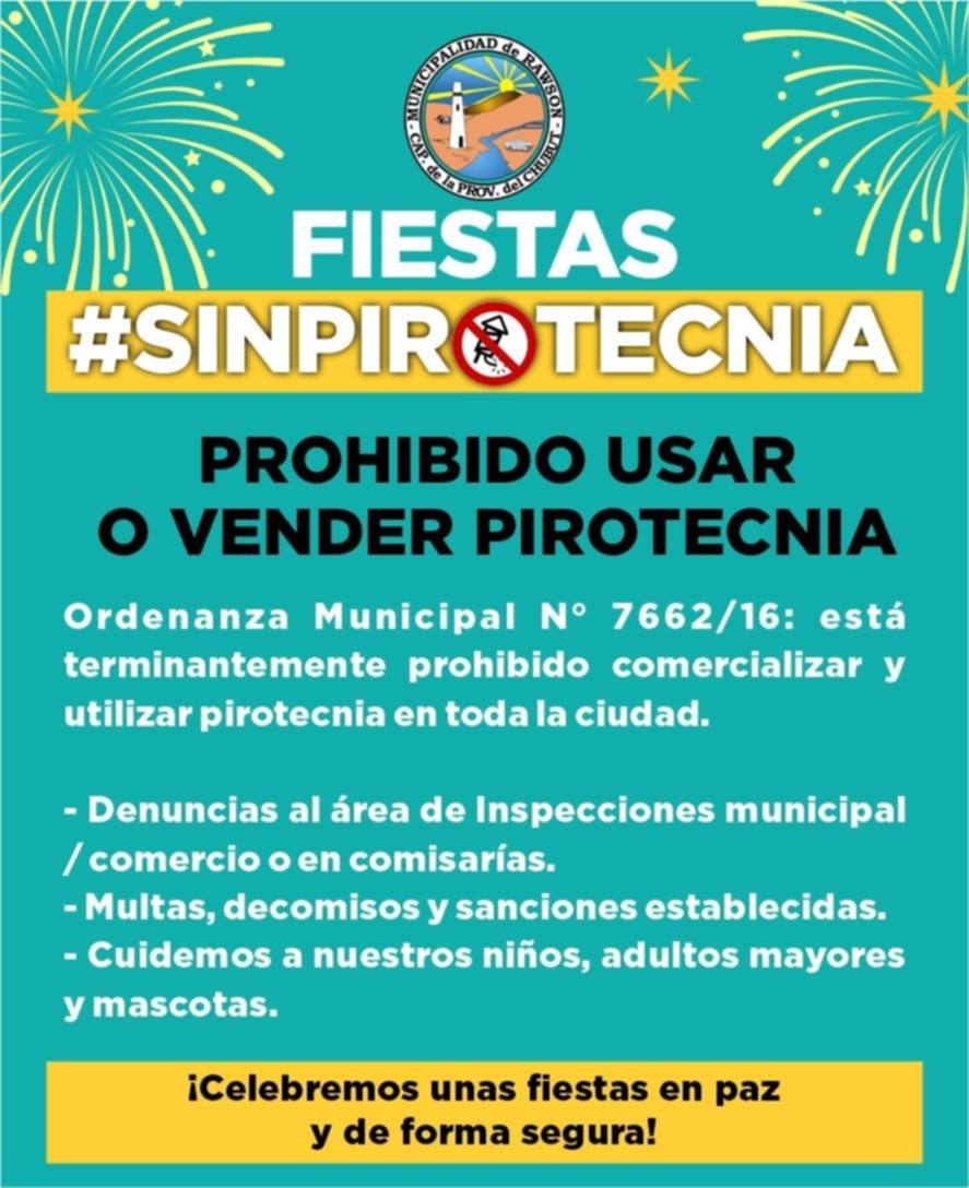 En el marco de las celebraciones de fin de año, la Municipalidad de Rawson recuerda a la comunidad que se encuentra terminantemente prohibido el uso y la comercialización de pirotecnia en todo el ejido urbano, conforme a lo establecido por la Ordenanza Municipal N° 7662/16, vigente en la ciudad capital