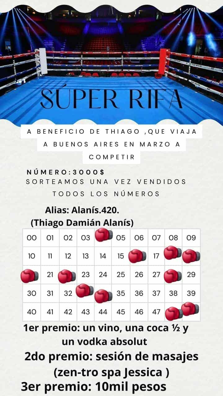 Con el objetivo de recaudar los fondos necesarios, Thiago lanzó una rifa solidaria. Los números se venden a un valor accesible y los premios incluyen bebidas, sesiones de masajes y dinero en efectivo. Todo lo recaudado se destinará íntegramente a solventar los gastos del viaje y participación del joven en la Copa Argentina de Kick Boxing.