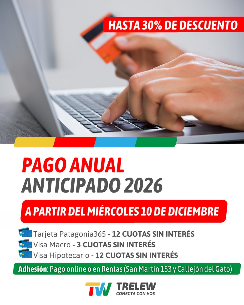 La Municipalidad de Trelew, a través de la Coordinación de Rentas, pondrá en marcha a partir del miércoles 10 de diciembre el pago anual 2026 anticipado de impuestos, una herramienta que permitirá a los vecinos acceder a un descuento del 30% sobre sus obligaciones fiscales.