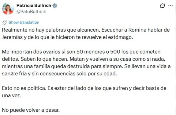 “Me importan dos ovarios si son 50 menores o 500 los que cometen delitos. Saben lo que hacen. Matan y vuelven a su casa como si nada, mientras una familia queda destruida para siempre”, sostuvo la ex ministra de Seguridad.