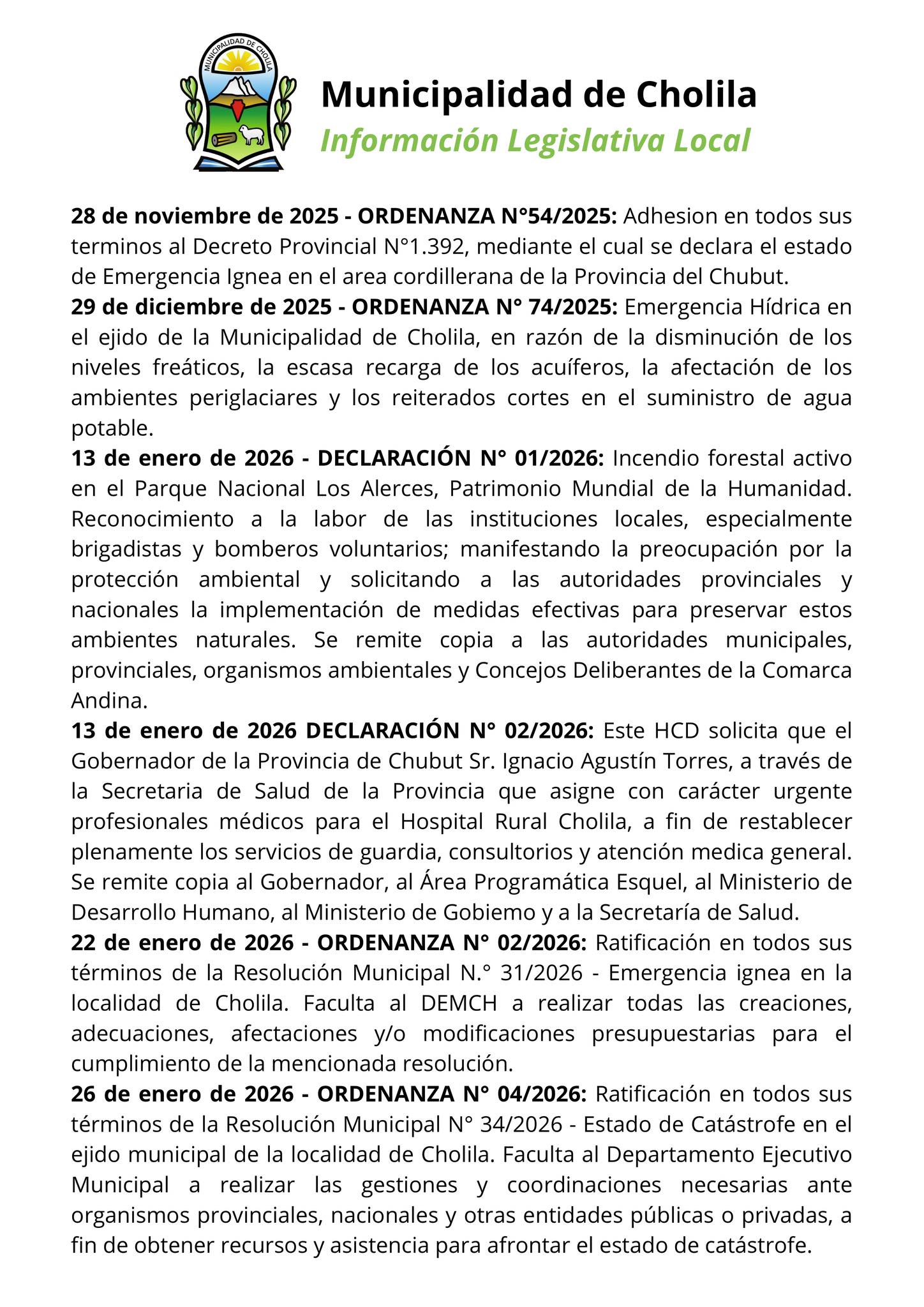 El Honorable Concejo Deliberante aprobó la Ordenanza N.º 04/2026, la cual convalida la declaración previa de estado de catástrofe emitida por el Ejecutivo Municipal. Según Radio 3, esta normativa es clave para otorgar facultades extraordinarias que permitan realizar adecuaciones presupuestarias inmediatas.