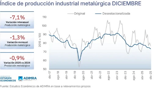La actividad metalúrgica registró en diciembre una caída del 7,1% interanual y un retroceso del 1,3% respecto de noviembre, de acuerdo con el último Informe Mensual de Actividad elaborado por la Asociación de Industriales Metalúrgicos de la República Argentina (ADIMRA). El sector cerró así un año marcado por la debilidad productiva, con fuertes bajas en rubros estratégicos y niveles de utilización de la capacidad instalada en mínimos históricos.