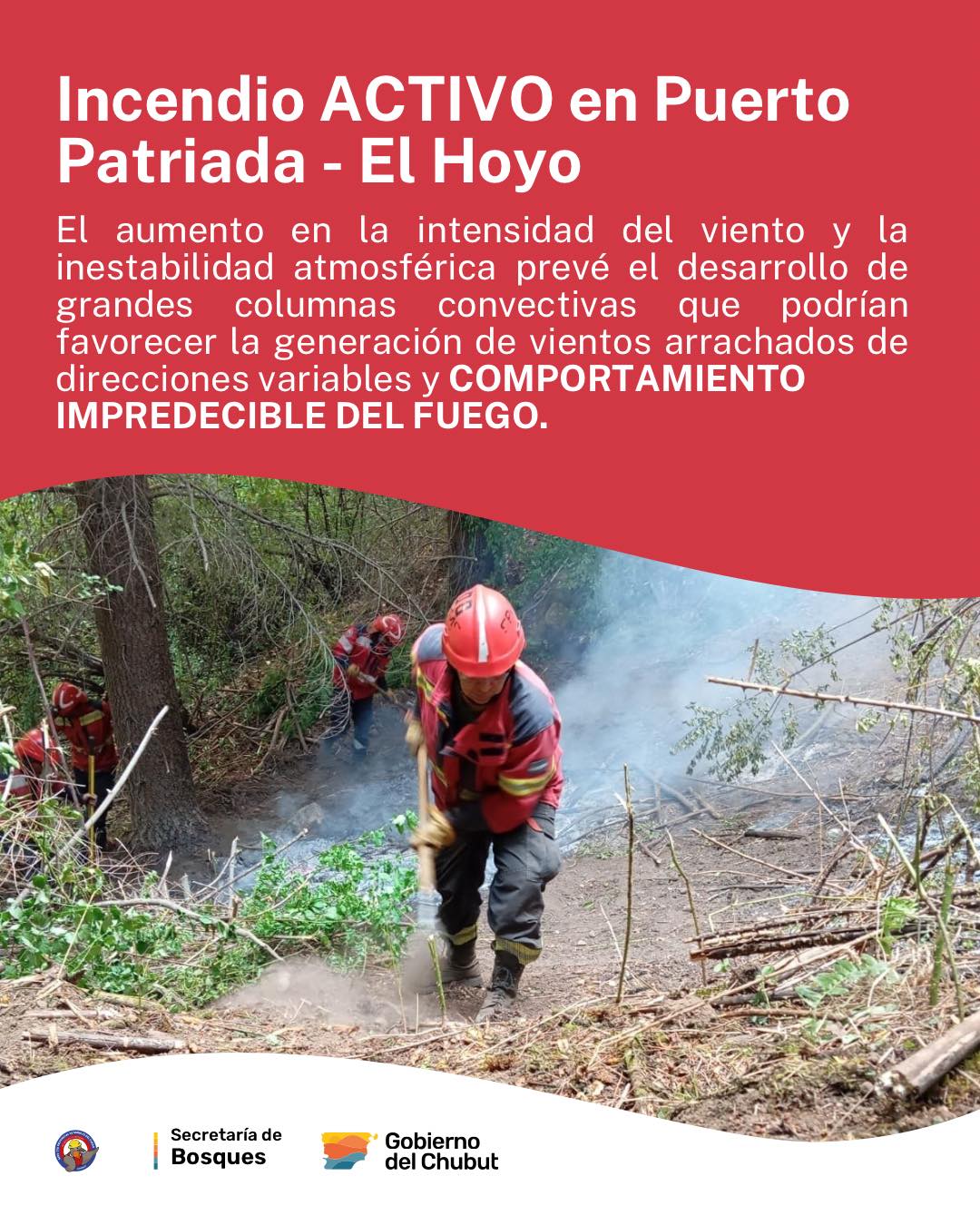 Incendio activo en Puerto Patriada: riesgo elevado por viento y condiciones extremas. Operativo interinstitucional trabaja para contener el fuego en El Hoyo.